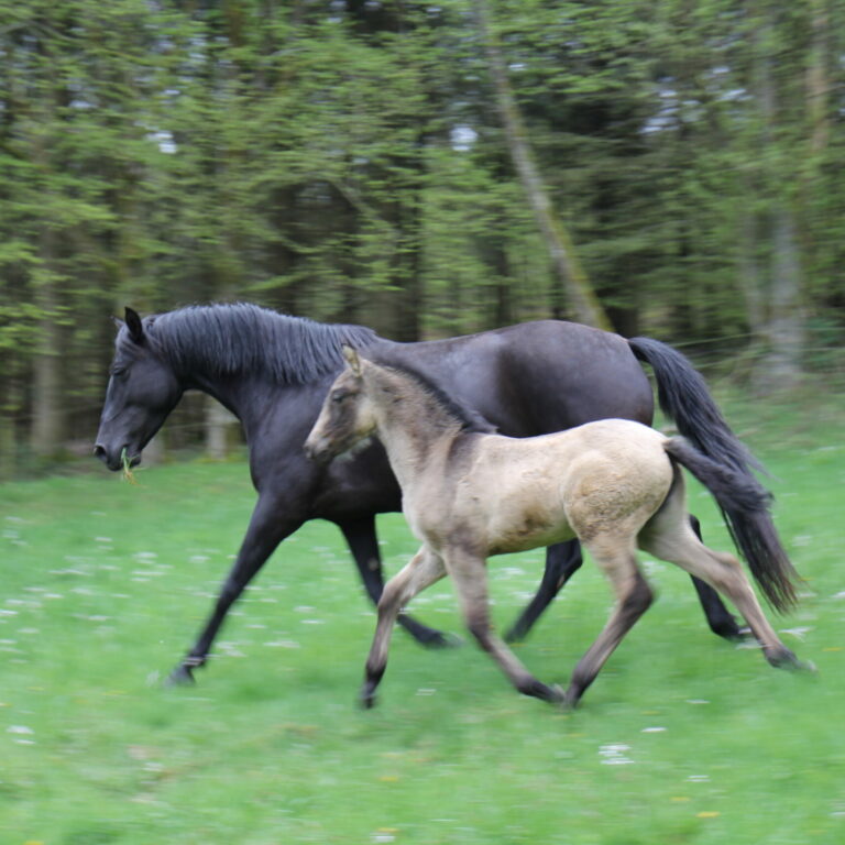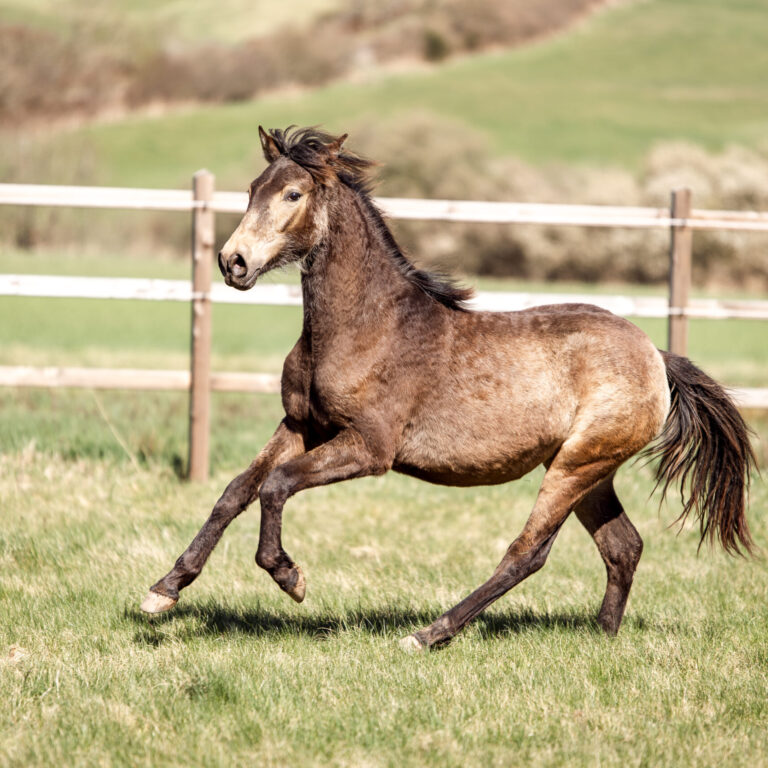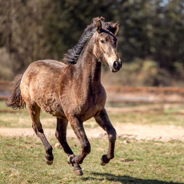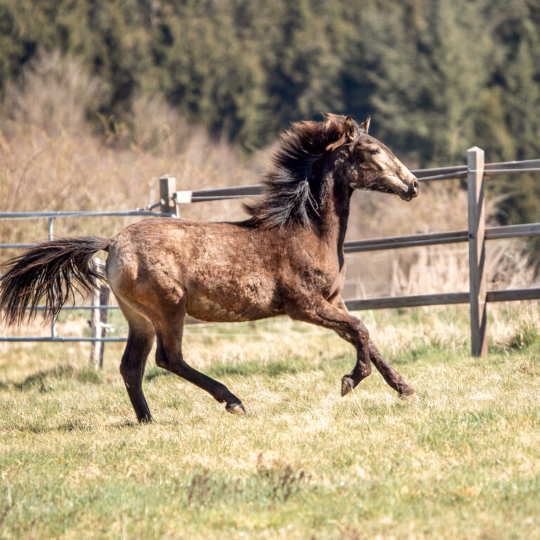 Mit ihrer außergewöhnlich seltenen dunklen Bayo-Farbe zieht sie alle Blicke auf sich – ein echter Hingucker, der auch züchterisch von großem Interesse ist. Doch nicht nur ihr Äußeres ist bemerkenswert: ALEGRIA begeistert mit ausdrucksstarken, elastischen Bewegungen, einem kraftvollen Hinterbein und einer natürlichen Selbsthaltung, die selbst erfahrene Pferdeleute staunen lässt. Sie zeigt schon jetzt Balance und Schwung, wie man sie sich für die klassische Dressurarbeit oder die Working Equitation nur wünschen kann.